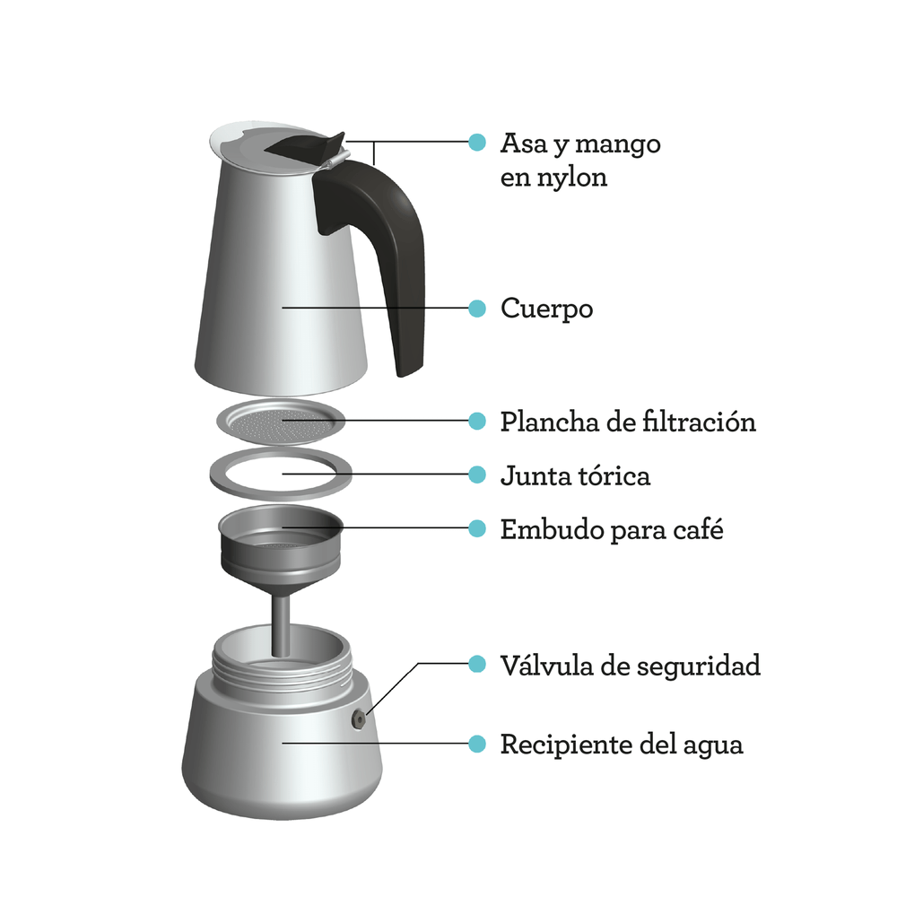 - Válvula de seguridad para liberar la presión acumulada durante la preparación del café.