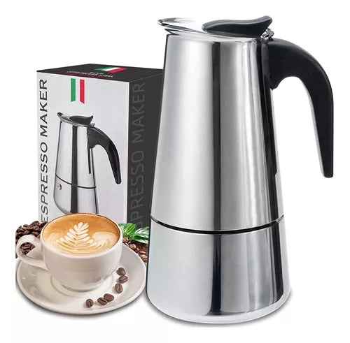 Descripción: Una cafetera italiana elegante y moderna de acero inoxidable, perfecta para preparar un delicioso café moka en cualquier tipo de estufa, ya sea de gas, eléctrica, de inducción, entre otras. Su diseño práctico y su material resistente aseguran una preparación rápida y fácil del café, ideal para los amantes del café que buscan calidad y sabor en cada taza.