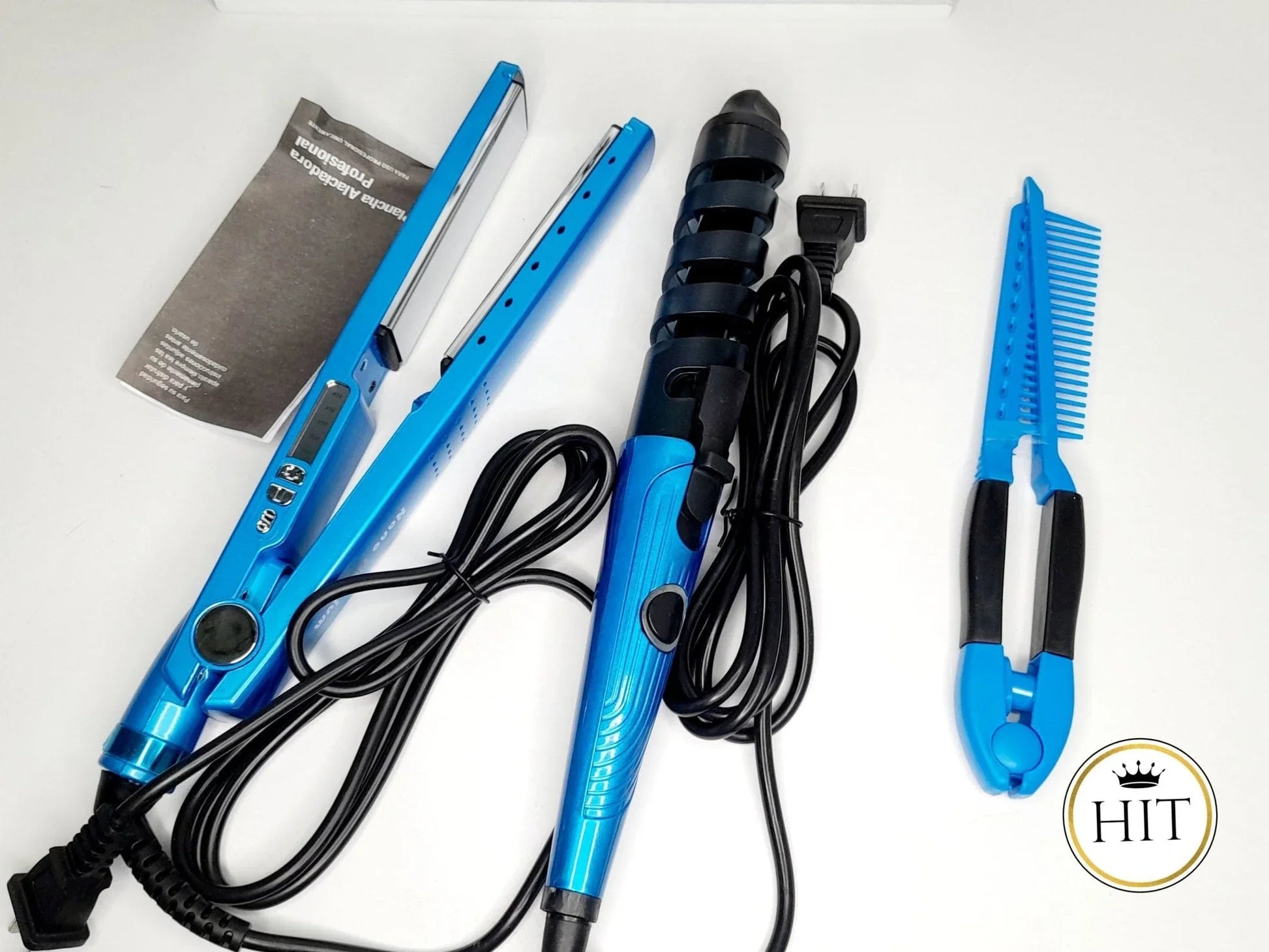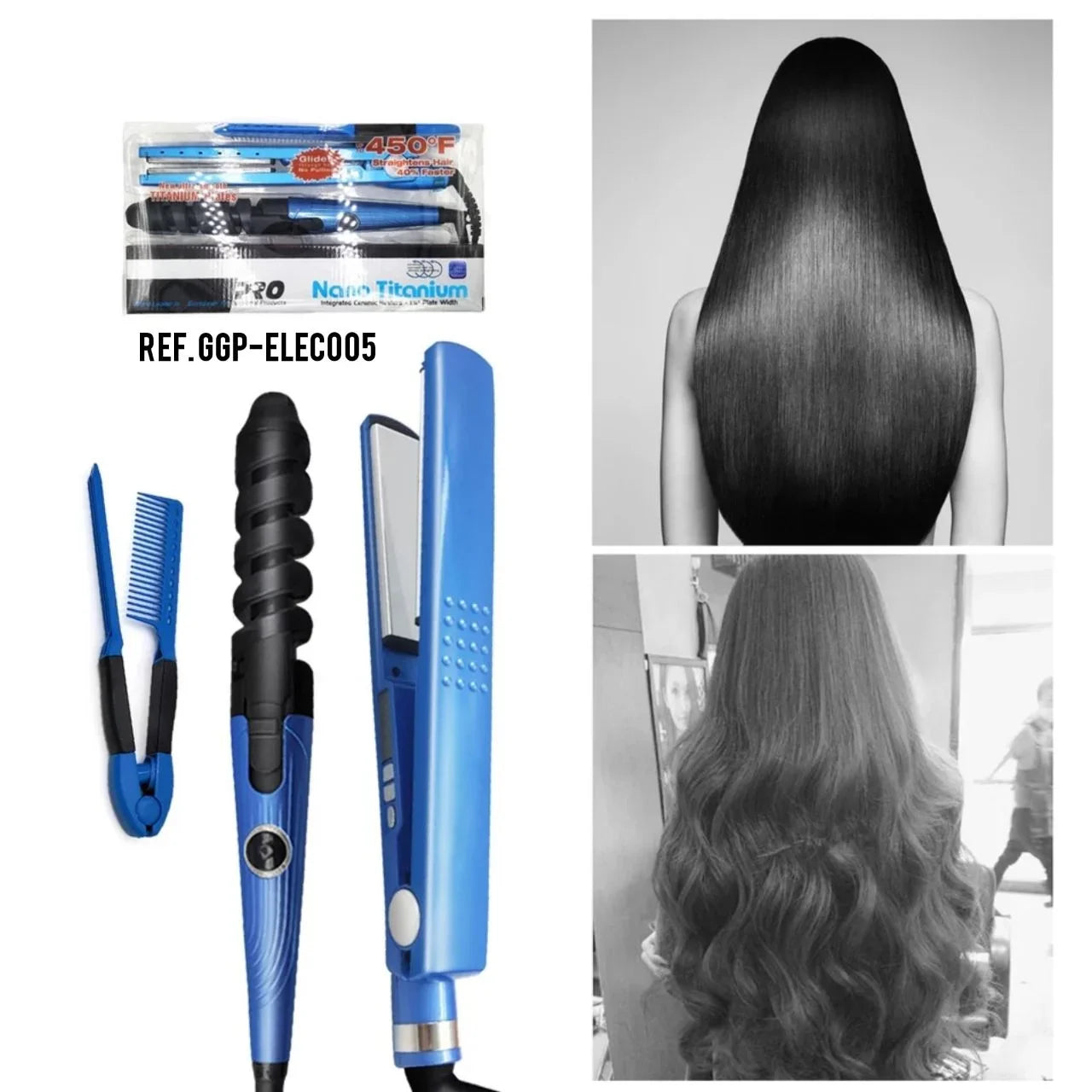 COMBO!! PLANCHA DIGITAL LINEA TITANIUM 450 F + RIZADOR + PEINILLA SECADOR DE CABELLO . Plancha Digital con Tecnología titanio De 450ºF. Esta plancha es un accesorio indispensable para el uso diario que protege el cabello gracias a su recubrimiento en cerámica y 2 veces más titanio en sus patines o plaquetas dando un buen y rápido desempeño y un liso perfecto con larga duración y reducción de frizz.