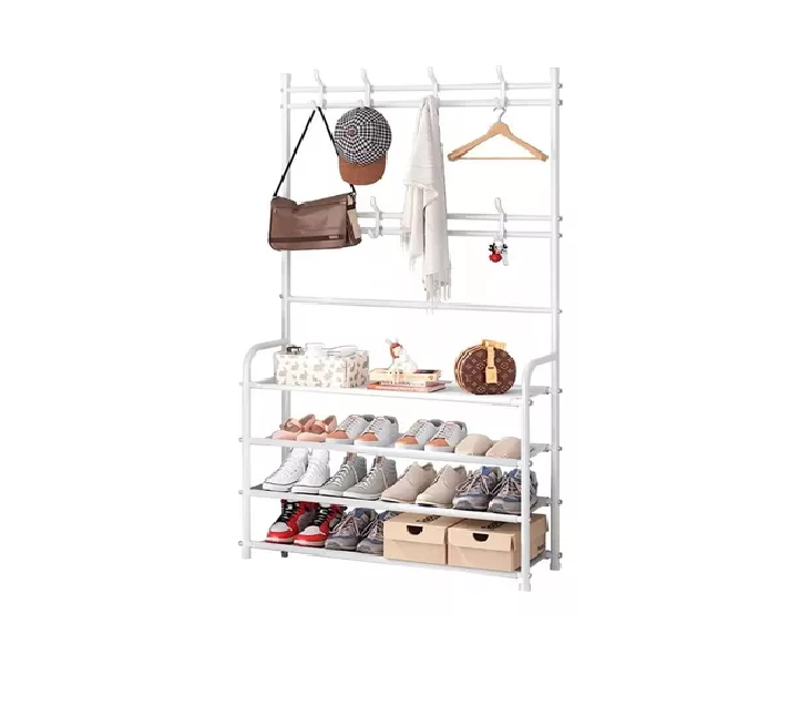 Fabricado con materiales metálicos de alta calidad, este perchero es resistente y duradero, garantizando una larga vida útil. Sus 5 niveles de estantes y cajones ofrecen amplio espacio para colgar abrigos, chaquetas, bolsos y zapatos, manteniendo todo en orden y al alcance de tu mano.Además, su diseño multifuncional te permite utilizarlo como zapatero, ahorrando espacio y manteniendo tus zapatos organizados y protegidos.